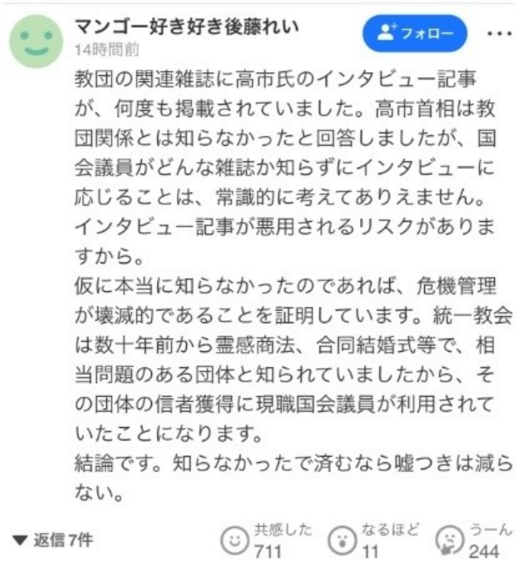 また別のユーザーは、国会議員は取材に応じる前にメディアの背景情報を確認するのが通例であり、高市氏の「知らなかった」という主張は納得しがたく、仮に本当に知らなかったとしても、業務に不手際があり、必要な危機管理意識に欠けることを示していると指摘した。